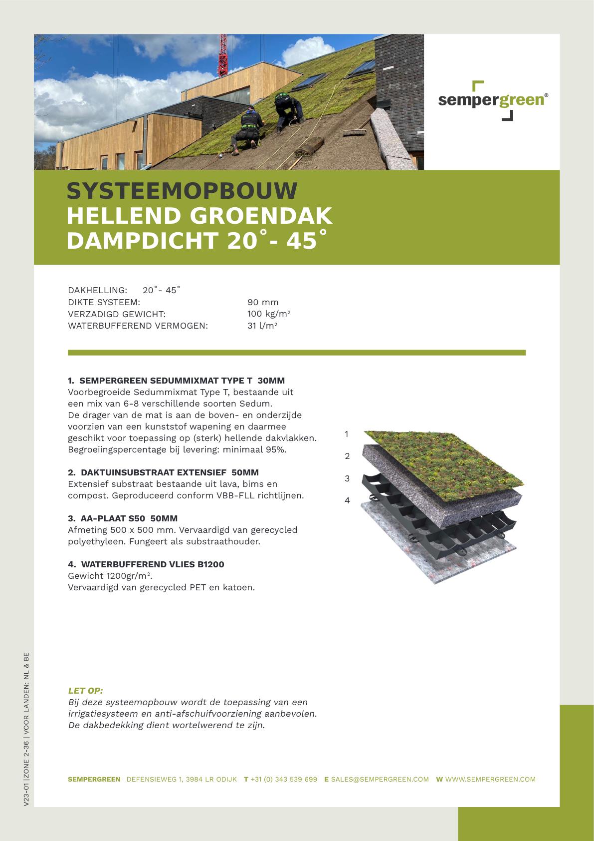 Wij adviseren om een irrigatiesysteem aan te brengen voor voldoende vochtvoorziening. Bevestig daarnaast een waterkerende dakopstand aan de dakconstructie, waarvoor ons scheidingsprofiel gebruikt kan worden. Sluit het hellende groendak op met een dakrandprofiel. Vergeet niet het boldraadrooster te plaatsen voor een vrije afvoer van hemelwater. Houd het groendak ten slotte vitaal met onze conditioner of nutrition.