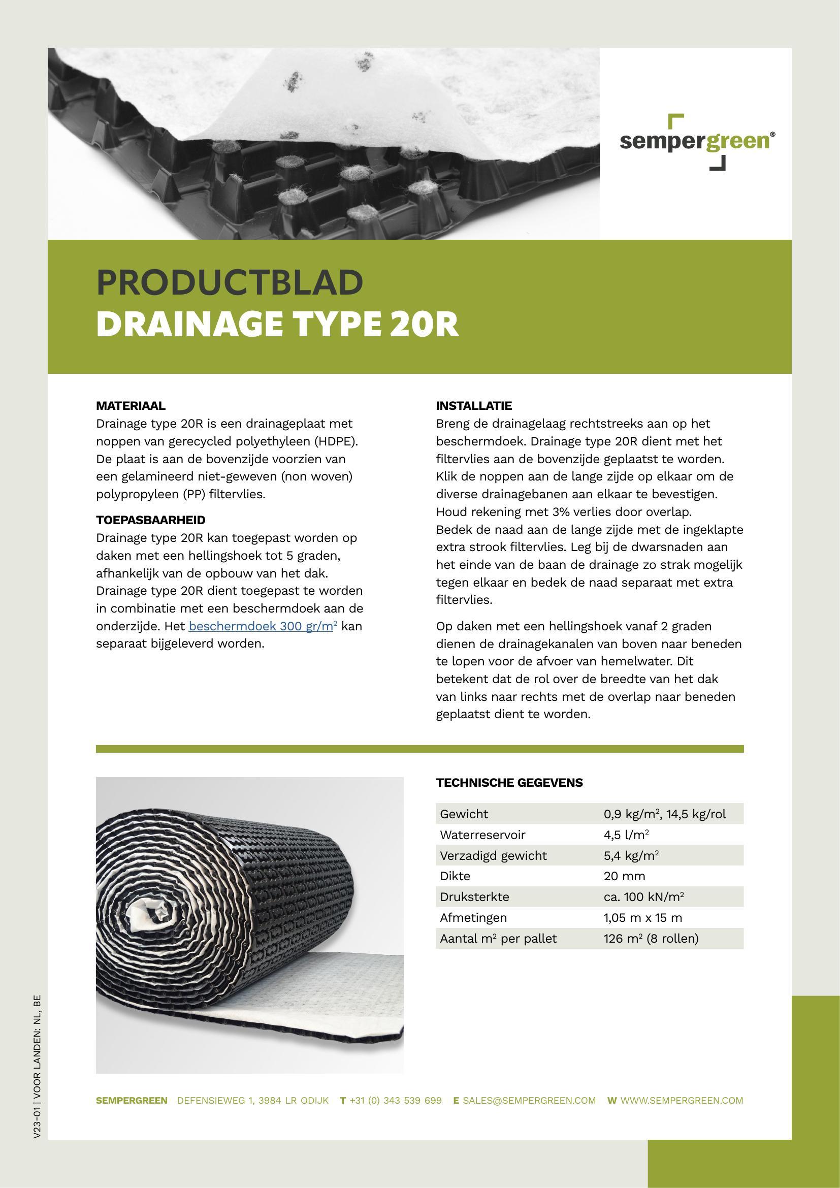 Drainage type 20R dient toegepast te worden in combinatie met een beschermdoek aan de onderzijde.