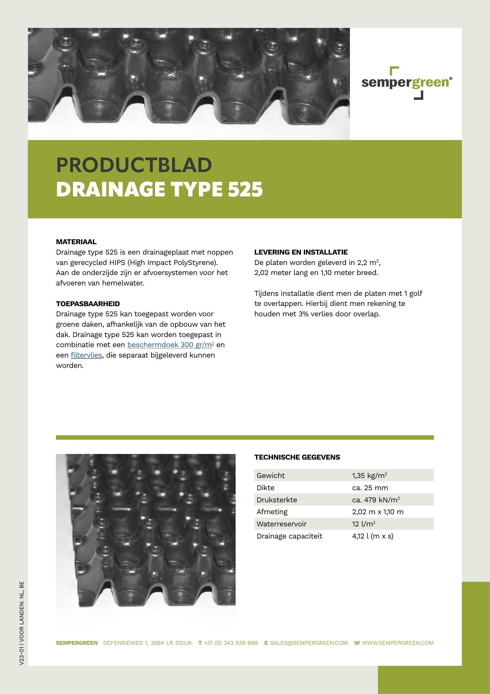 Drainage type 525 kan worden toegepast in combinatie met een beschermdoek 300 gr/m2 en een filtervlies, die separaat bijgeleverd kunnen worden.