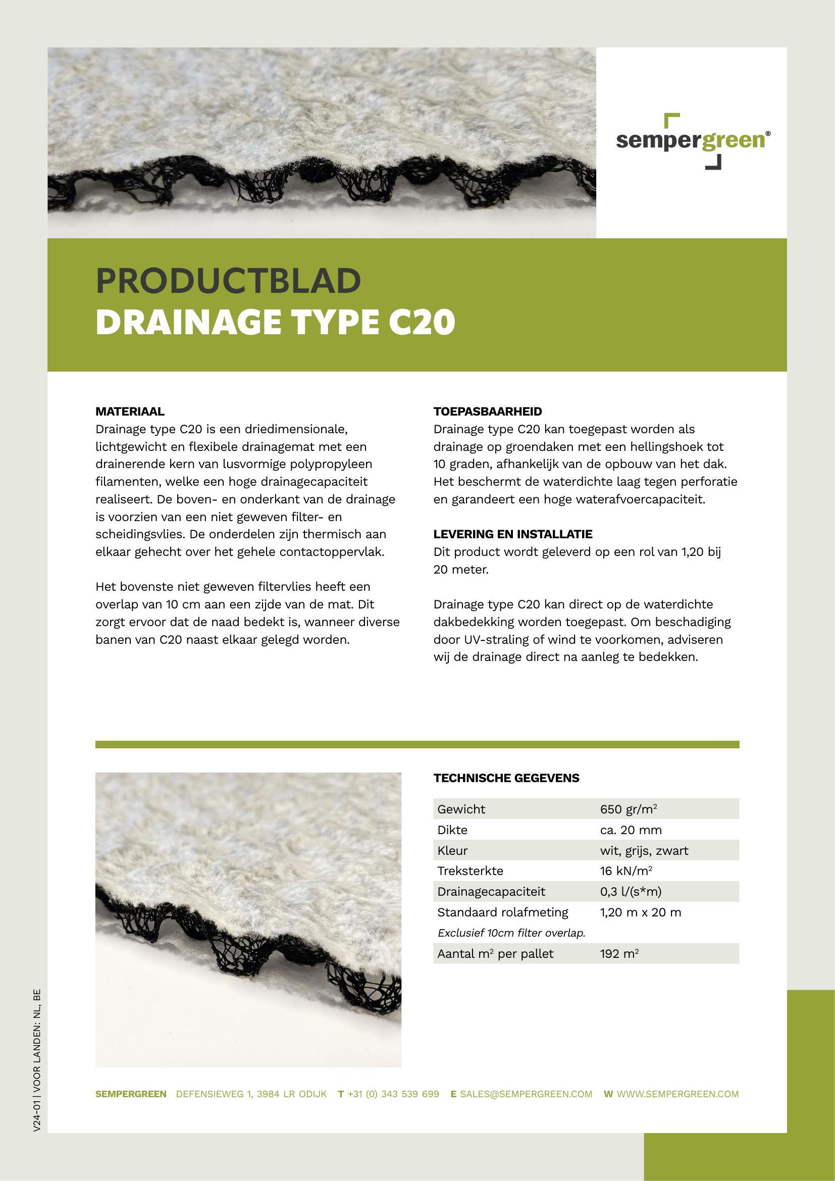 Drainage type C20 is een driedimensionale, lichtgewicht en flexibele drainagemat met een drainerende kern van lusvormige polypropyleen filamenten, welke een hoge drainagecapaciteit realiseert.